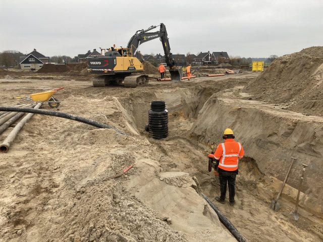 Voordat de bouw kan beginnen, moet de grond bouwrijp zijn. De grond is bouwrijp als het schoon is en er geen dingen meer in zitten, zoals stenen of wortels van bomen en planten. Tijdens het bouwrijp maken leggen we ook de riolering aan en hogen we de grond op. Daarnaast leggen de nutsbedrijven de benodigde kabels en leidingen aan, bijvoorbeeld voor water en stroom.